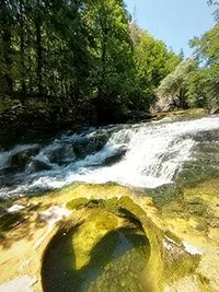 Le chemin commence par longer le bord du lac, sur une section particulièrement sauvage où la forêt touche le lac... Puis le chemin remonte le cours de la rivière Boiron dans une forêt avec des énergies puissantes.